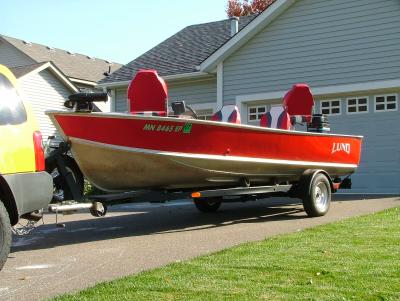 Here's the boat and trailer finished. The trailer was wire wheeled and painted semi-gloss black after I replaced the tail lights and wiring, moved the spare tire, and rebuilt the roller assemblies. I installed a flat plank to walk on when launching and loading.