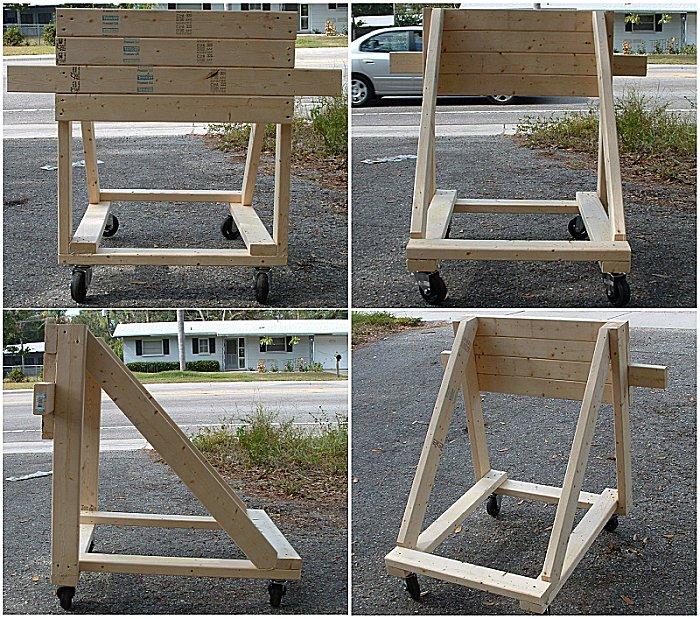 The base is 30" wide by 33" deep and the stand is 38" from the ground to the top. The wings sticking out from the face are handles to lift the loaded stand out of cracks and potholes in my asphalt driveway. Note that the verticals are put into compression rather than shear for maximum strength.