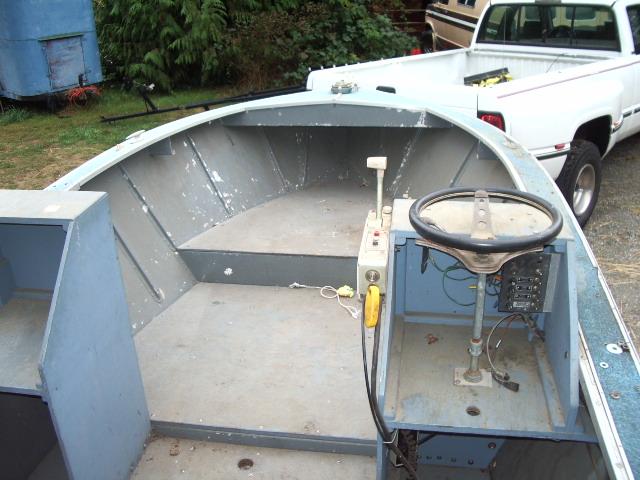 This picture is taken from the stern, and shows the setup of the consoles. They aren't badly built, but I'm still aiming for one center console. For now, I'm in the process of sandblasting the hull while the weateher is good, and then I'll remove the floor and consoles. The deck is just screwed to aluminum stringers with stainless steel screws. Thank God for power and pneumatic drills!