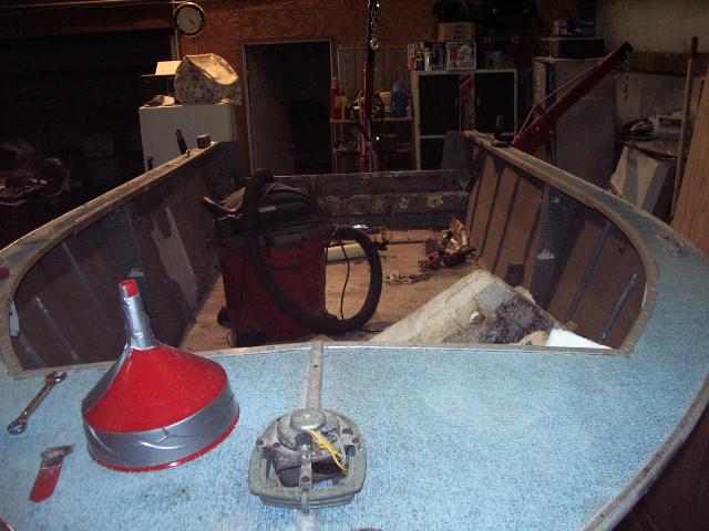 The picture quality isn't great because it took until well after dark to get everything finished and cleaned up last night. Just the same, here's a picture of the interior, taken from the stern after removal of the consoles. The boat actually looks smaller with them out, but I hope to at least have the new one built by the end of the weekend. I didn't take pictures, but 3/4 of the outside of the hull is also sandblasted now. When I finish taking the deck out, I'm going to finish that job, sandblast the inside of the hull, and I'll post pictures early next week. All said and done, I got 3 days of work in this week. The motor is out, transom is disassembled, half of the floor is out, consoles are out, and half of the exterior hull is clean. I'm pretty happy with the progress. I'm realizing that aluminum work is much, much faster than fiberglass and if it weren't for the upcoming expenses of supplies and my busy schedule with the Navy, I'd honestly believe that 3 weeks of hard work will have this boat completely rebuilt. Pretty exciting!