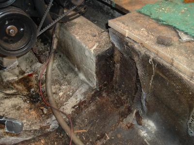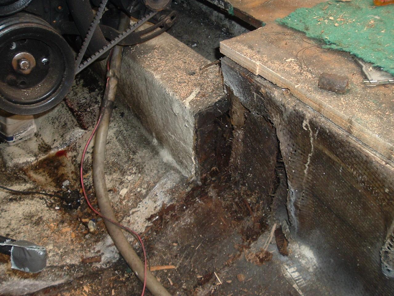 Pic of rotted engine stringer. Going to pull engine and start the replacement soon. This past weekend my boys came over and replaced my 8'X7' garage door with a 9'X7'. The old header was a problem to get out, but afetr a few beers and the CHAINSAW! No problem!!!!!!!! Wow, should have been there! Talk about PWT! Now I can pull the boat and trailer in for Winter!