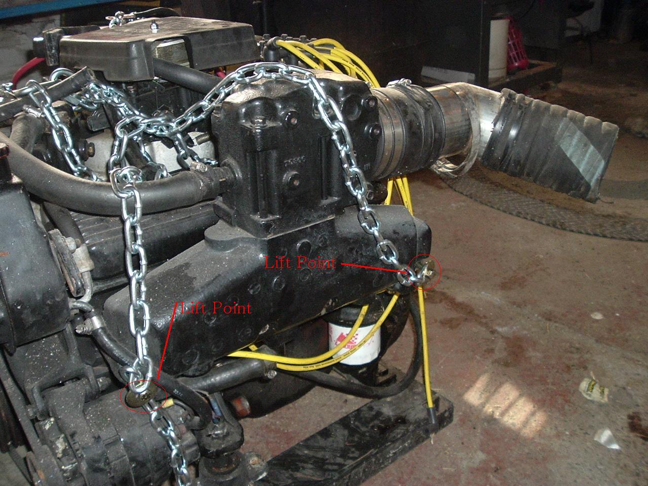 This was my first time lifting out an engine. I used 6" bolts hardened #8 with washers and 2pcs. 5Ft. 1/4" Chain. Then attached a 2Ft. Pcs. of Chain using 2000lbs. locking "D". I made purchase at Depot for Chain and Hardware. Then I used A Cherry Picker to lift out the engine. Only clearded the 5' transome by 2". Once the engine was up, we pulled the boat forward. *** NOTE:Make sure you extend the legs of your cherry picker all the way out ! THe engine came out without any issues.
