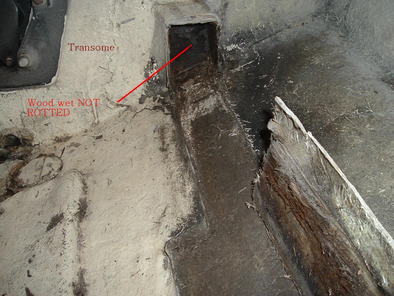 I dug out the old wood (it fell out). I started to get a bit scared because the wood was rotted right up to the transome. The transome is wet but not rotted at this point. I'm going to place a heat lamp over the area for a while.