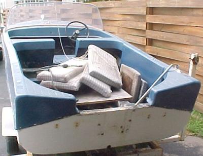 Well, its not a starcraft thats for sure.. The seating in this boat is kind of interesting. 1st the driver & passenger seats are molded in fiberglass, you can see the back of the seats, its the blue part with the walk through opening in front of the pile of cushions. The rear seats are REAL interesting.. They are bench seats that face the CENTER of the boat. They are very low to the floor, like 4 to 6 inches. (they have got to go)