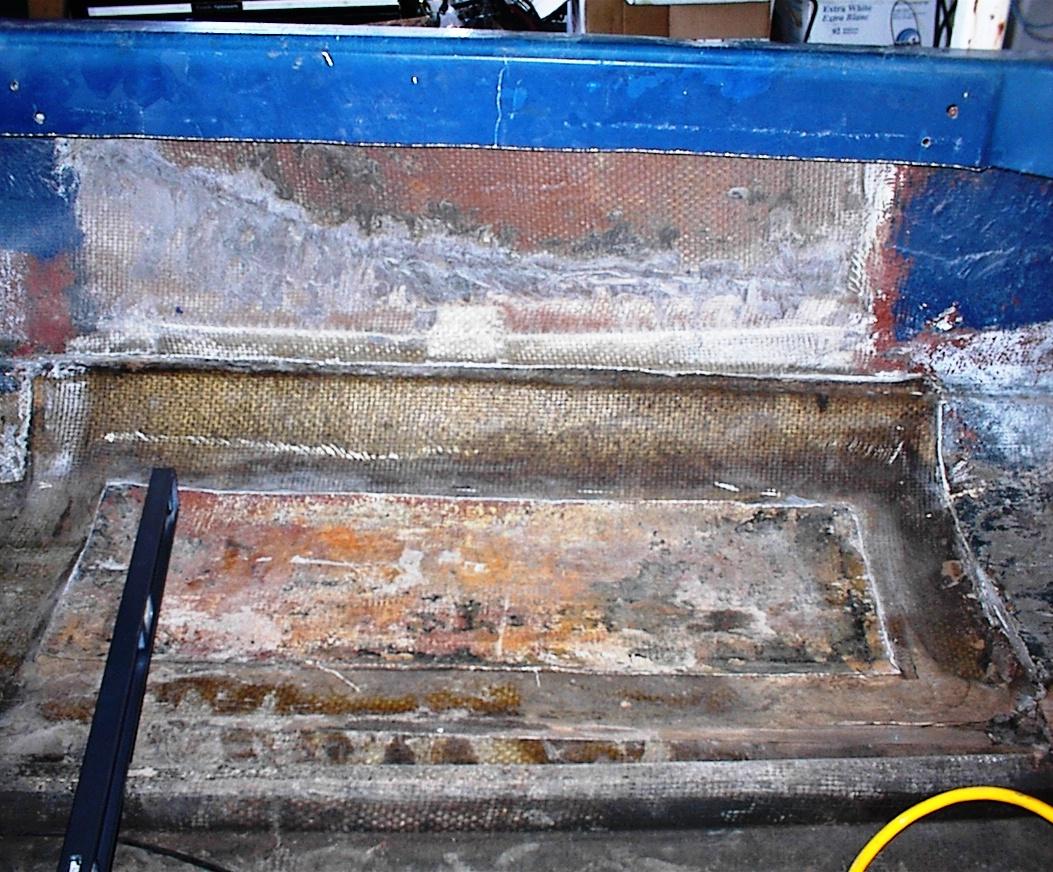 More to remove of the rear seats. I had previously removed the seat bases, now I wanted to take out the backs, which where long extentions of the deck molding. The inside edge of the gunwale extended down and attached to the hull. I cut the gunway off straight and removed all of the extra stuff in the hull.