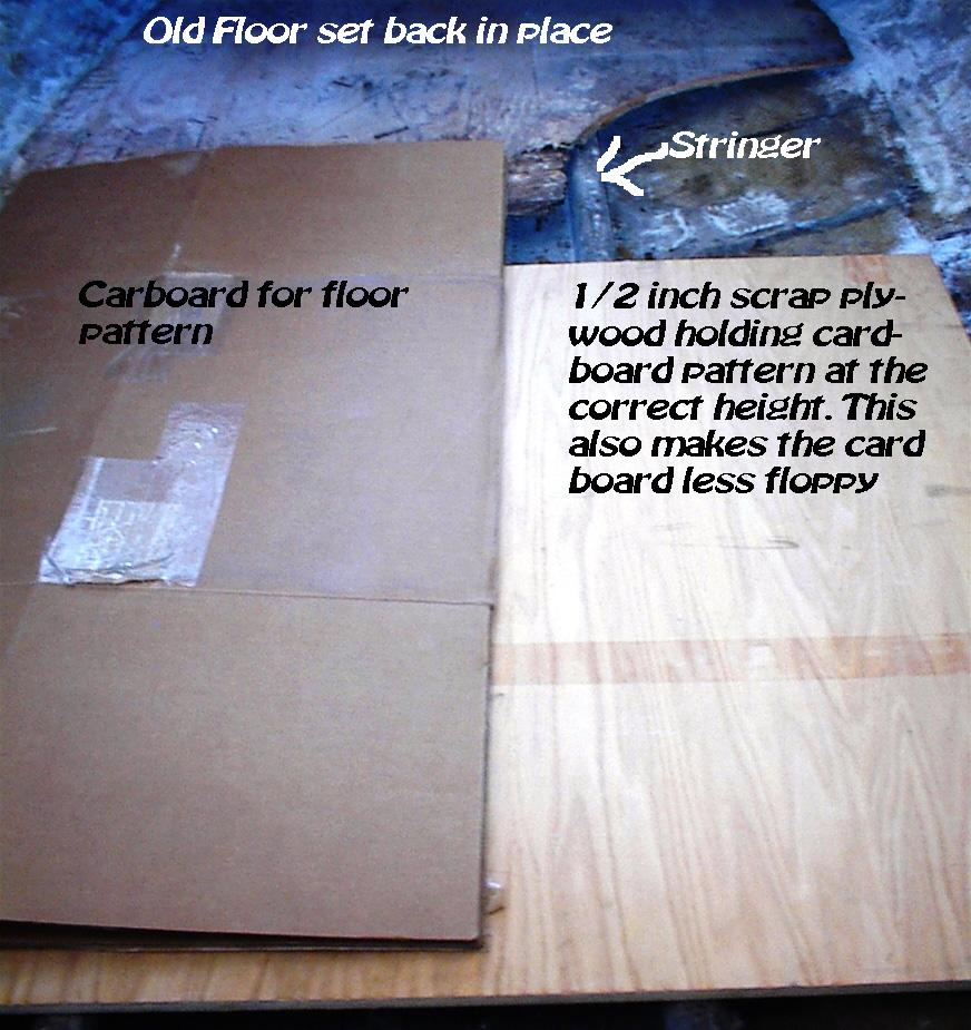 To make the pattern, we cleaned everything up. We placed the old front floor section back in place and stapled card board to it as an extension. To hold the cardboard at the right height and give us a good working and writing surface we laid a scrap piece of 1/2 inch ply across the rear stringers.