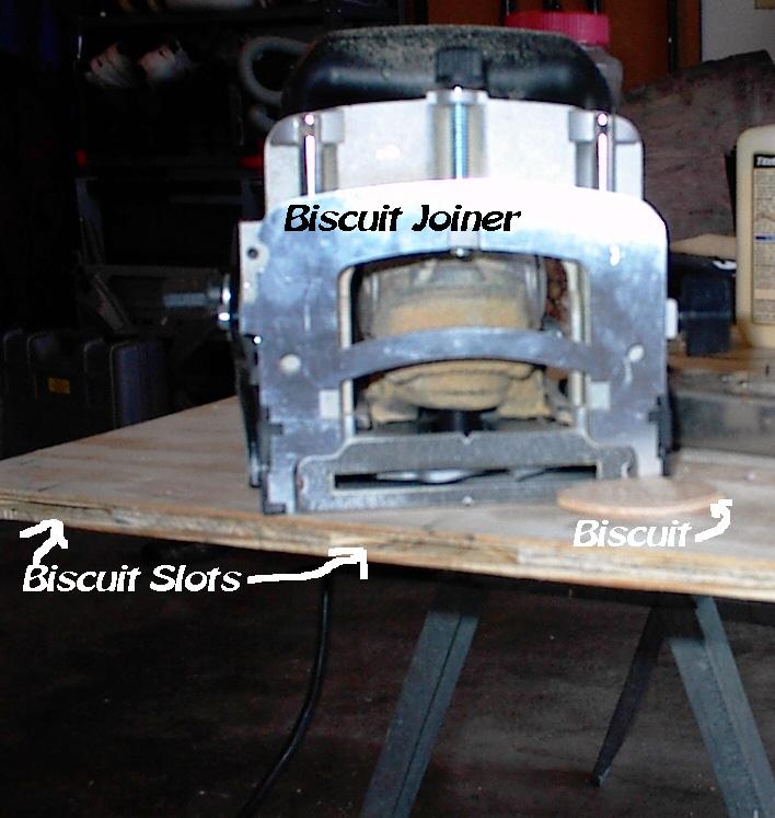 To attach the piece to the 4 x 8 sheet I turned back to carpentry again. This is a biscuit joiner setup. It cuts slots for 1/8 inch thick compressed wood ovals, "Biscuits", that are glued into the slots. The "biscuits" swell in the glue so they can hold the joint together and align the top surfaces perfectly. Thats why I choose to use it.