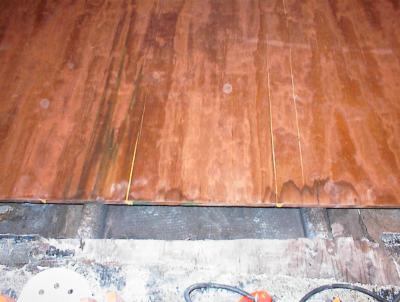 With the floor centered at the rear, we measured from the floor edge to the inside of the hull on both sides and then we marked where the stringers were at the rear. That way we can put lines on the floor to follow when we screw the floor down.