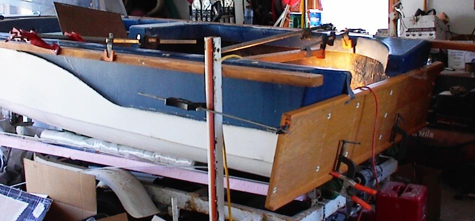 Once we started to clamp things up we figured out that the bowed gunwalwes were a part of or contributed to the outward bow in the deck moulding at the transom.