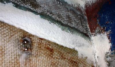 We have started the process of reinforcing the hull to deck joint at the transom. With this area clamped straight, we put one layer of our 'hairy' filler in here and some looking around seems to show that we need one more layer of filler in here to make this flat and then we'll add a layer of mat and one layer of cloth before we put the wood in place..