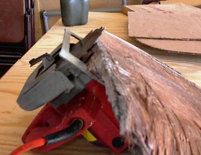 We are happy with our cardboard pattern, so we are going to transfer that to the 3/4 inch plywood. Some math is involved because all transoms are angled about 14 to 15 degrees from vertical. So, where the wooden transom meets the floor needs to be angled as well and it must follow the curve of the floor. This is a picture of us comparing the angle we had set on the circular saw with the angle on the OLD transom. (Glad I kept that around for another week, before I threw it away.)