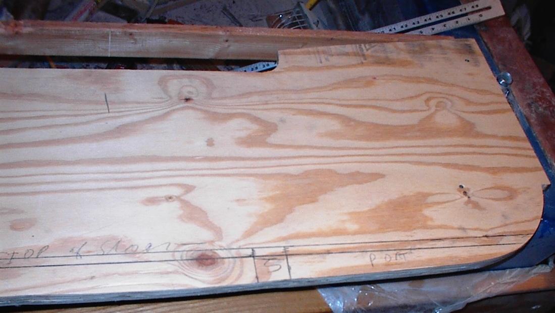 These marks on the transom are here to help us get the floor finished off. The rear edge of the floor needs to rest on something. Because there are no cross frames in this boat, we will have to add blocks of wood in front of the transom to support the floor. We also marked out the location of the stringers in case we need to add blocking for the transom to stringer knee braces.