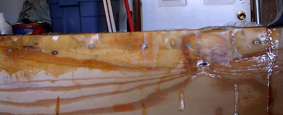 Well, this is the mess that I got out of my attempt to glass over the top of the transom at the motor well at the same time as I installed the transom.. Lots of buckling in the glass and I have to grind probably 50% of this off. So I will run a layer up and over from the inside once I get to that point