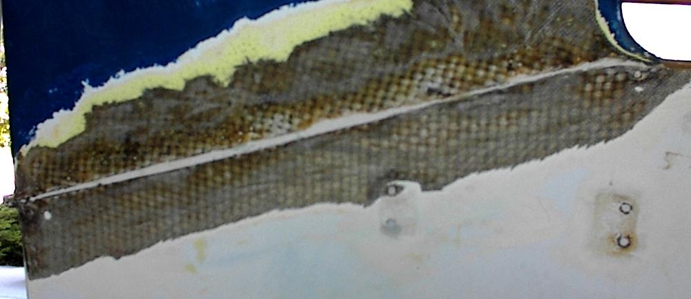Now that the transom is in and solid, we can glass over this hull - deck joint on the outside to seal up that side of the transom. We have ground off the multiple layers of paint and just through the old gelcote. The hull moulding is not real thick at this point and I don't want to grind through it.
