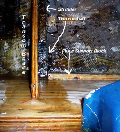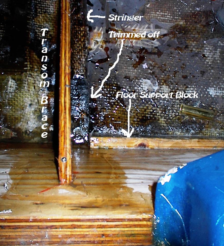 Here is a picture and descriptions of all of the structures and framing in the rear of the boat. You can see where the stringers were trimmed off and how the braces attach.