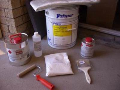 I then went up to the local fiberglass supplies shop. I walked out with my wallet $401.07 lighter but I have a whole roll of fiberglass mat, a drum of resin, hardener, talc, acetone, Styrene, woven roving and a roller & brush.