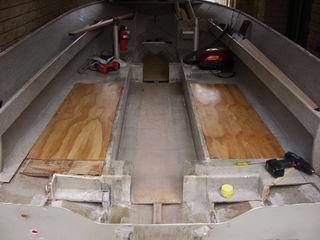 With this dry I repeated the operation with the side floor panels. With these panels I had bridging blocks in place and after running a layer of glass along the tops of the stringers I used stainless screws to secure the panels in place