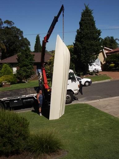 My mate Joe came and helped me flip the hull over. It ended up being pretty simple. We hooked the crane to the eye and lifted it up endways. We couldn'y do it sideways because I reckon it would have placed too much load on the fiberglass gunwales.