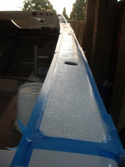 I used International Interdeck which are particles you can add to paint or sprinkle over the top. I still had some of the Newport 2 pack topcoat (the paint I didn't like earlier) and mixed a batch of paint and added the grit. I tried rolling the paint on but it didn't work as the grit tended to be pushed by the roller into the corners and edges. After some experimentation I discovered the best way was using a brush and 'dabbing' it on.