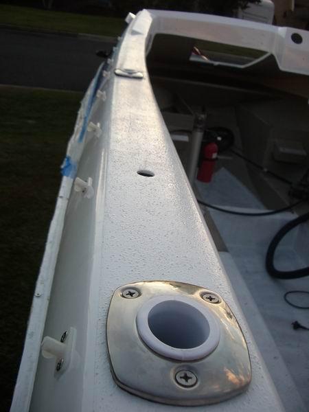 Rod holders fitted. This is a classic example of an easy job being anything but. The holes from the old rod holders had to be widened to suit the new ones, a job that took several hours. The best technique was to nibble the holes out with the edge of a drill bit.