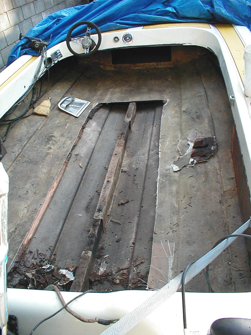 Removal of all interior, seats, carpet and partial removal of rotten floor to expose the rotten stringer. I was actually surprised to find there is only one stringer in this old boat. Not sure yet how far forward the stringer actually goes yet, but I will, soon.
