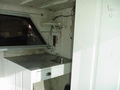 Sink with no water. Head with no toilet is across the "hall" through sliding door. (other side of white wall on right)