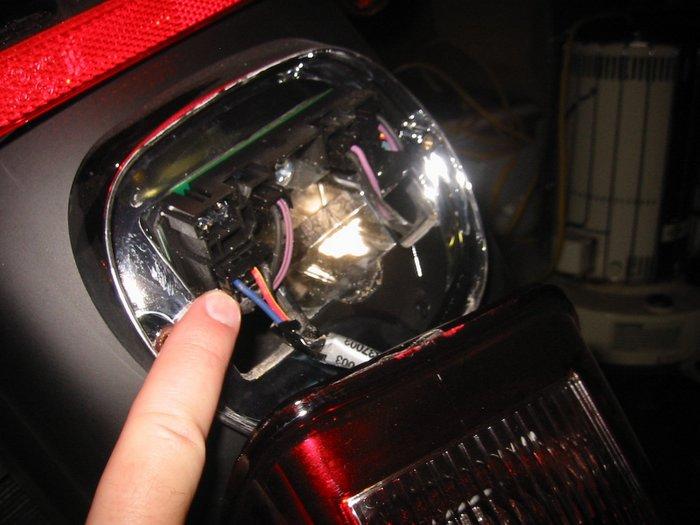 Unplug the stock bulb wiring harness at the connector in the base of the tail light. AMP connector release tab detail is shown in the next step.