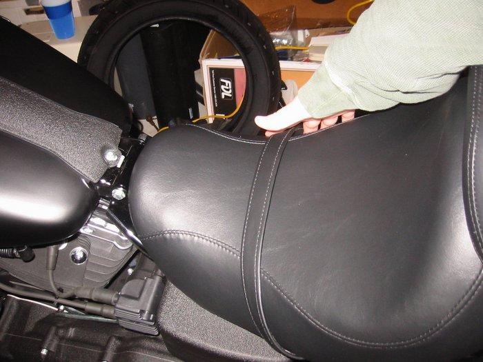 Now pull the seats back, away from the tank slipping the solo seat out from under the grab strap.
