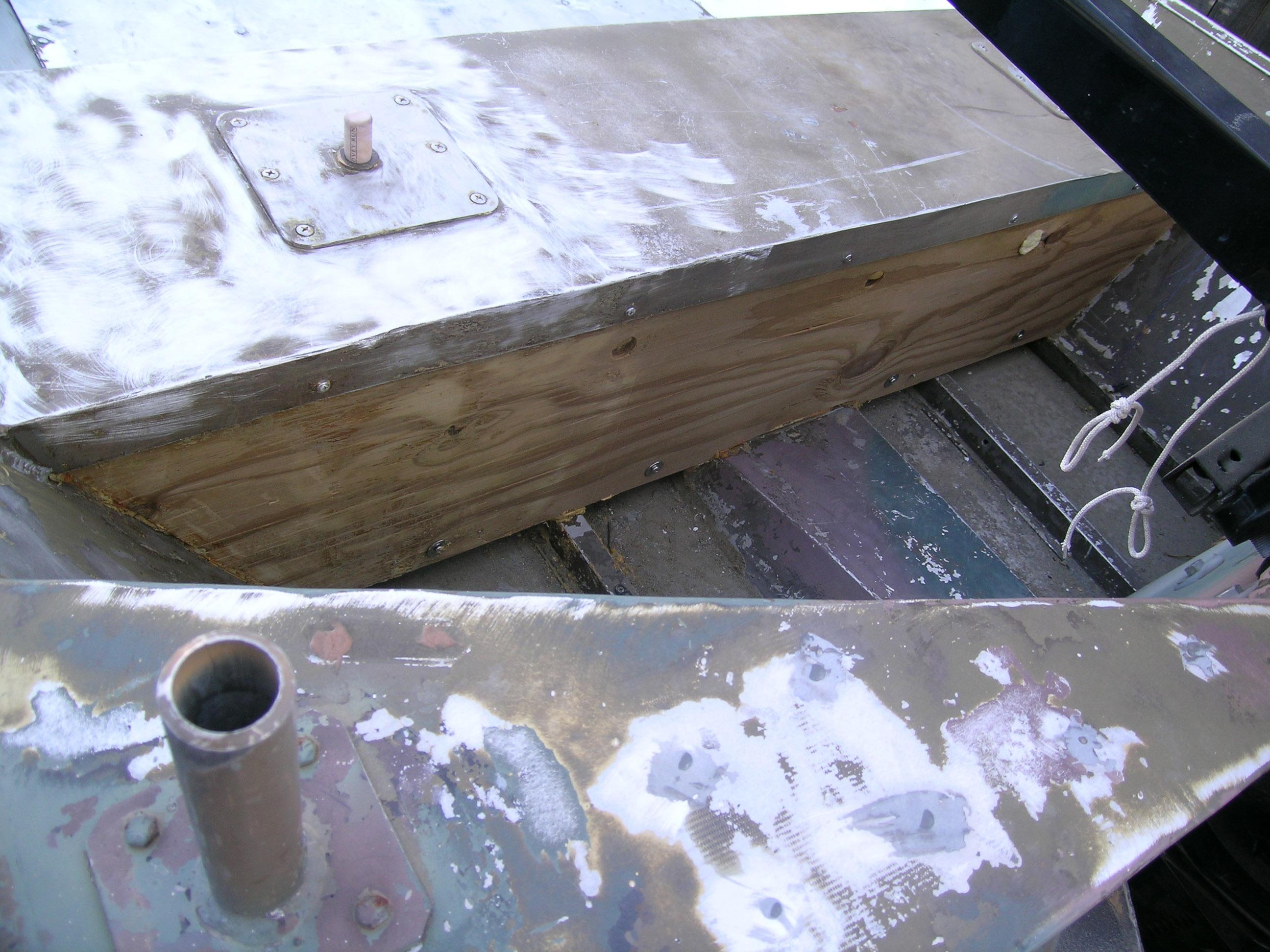 Space under seat was utilized for floatation by adding a 1/2" treated plywood bottom attached to the tops of the stringers. This allows water to pass through below. Also, as shown in this photo, is the vertical bulkhead to complete the enclosure. Foam was poured into the holes for the seat mounts. These small holes created quite a challenge to keep up with the rapidly expanding foam. Approximately 320 pounds floatation/ displacement was created.