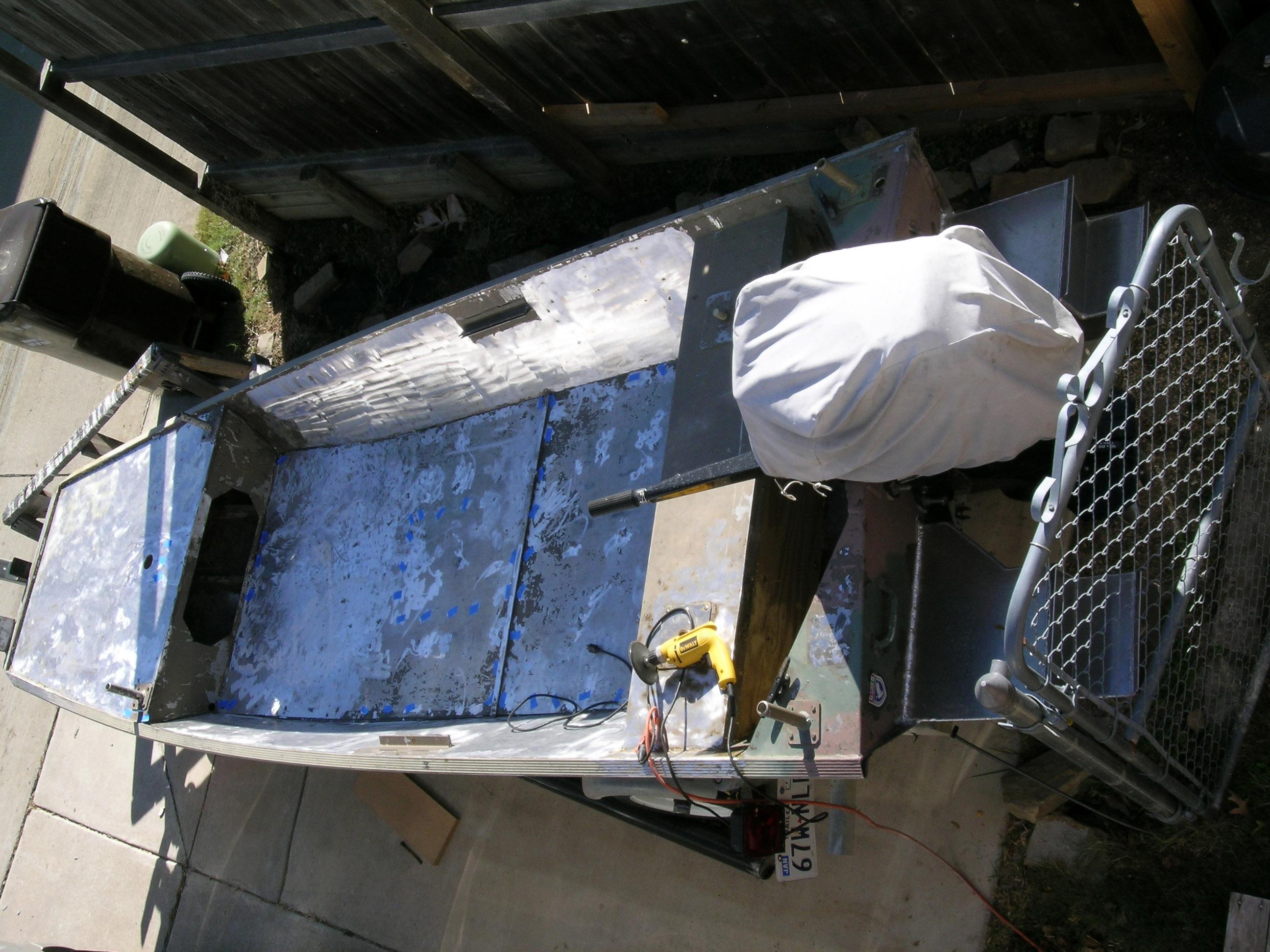 Carpet and glue has been removed, aluminum sanded and ready for primer. The aluminum floor is riveted to the stringers. After several years of hunting, fishing and shrimping, some of the rivets are loose. SS screws with threadlock were used to tighten the floor up and reduce rattling.