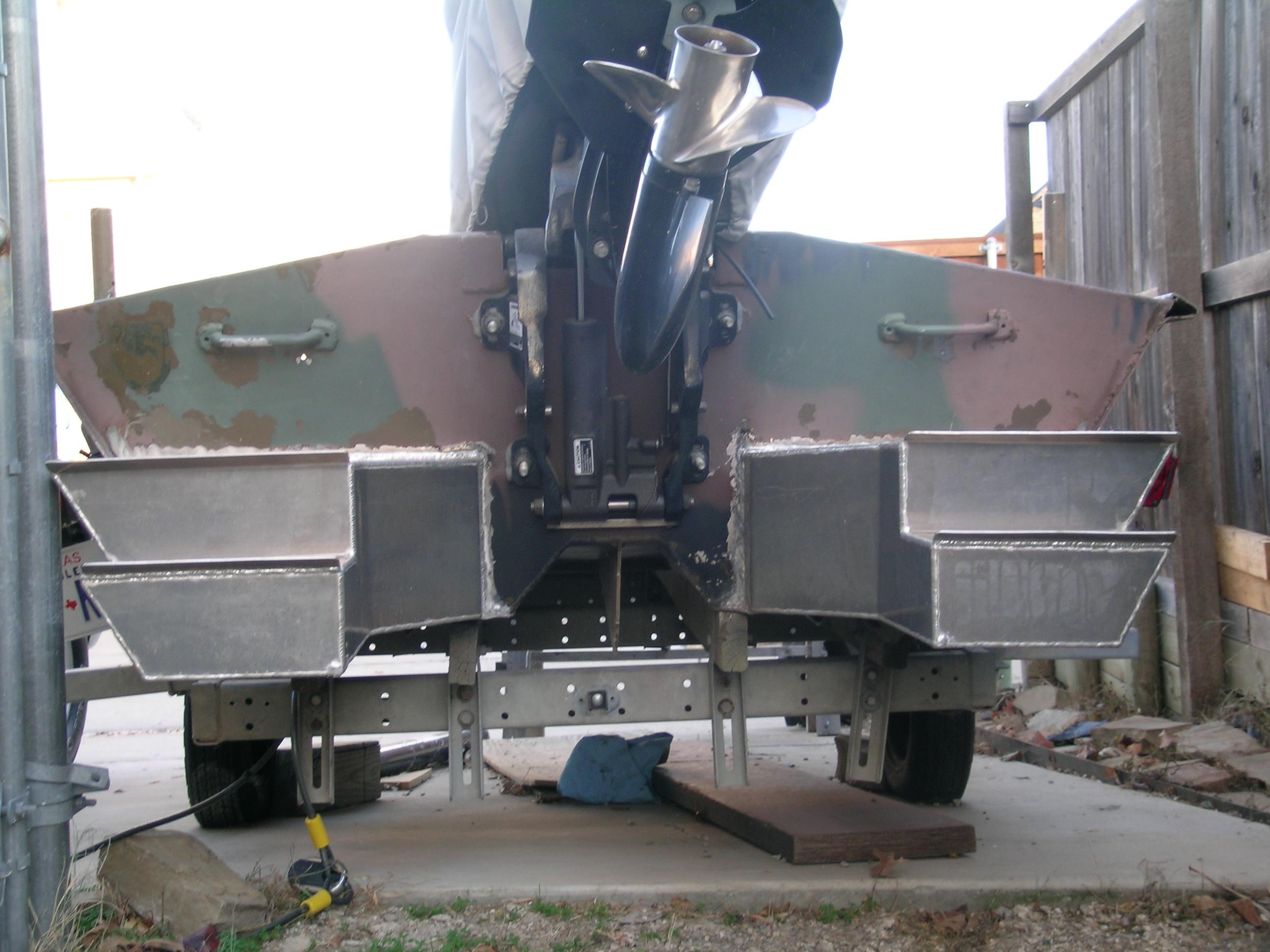 Note the tunnel at the transom. The tunnel as designed was ventilated, which I don't understand, as air is introduced where a channel of water is being created, thus causing cavitation. The ventilation hole was welded shut when the pods were added. The skeg protects the OB and helps keep out weeds, sticks and small logs.
