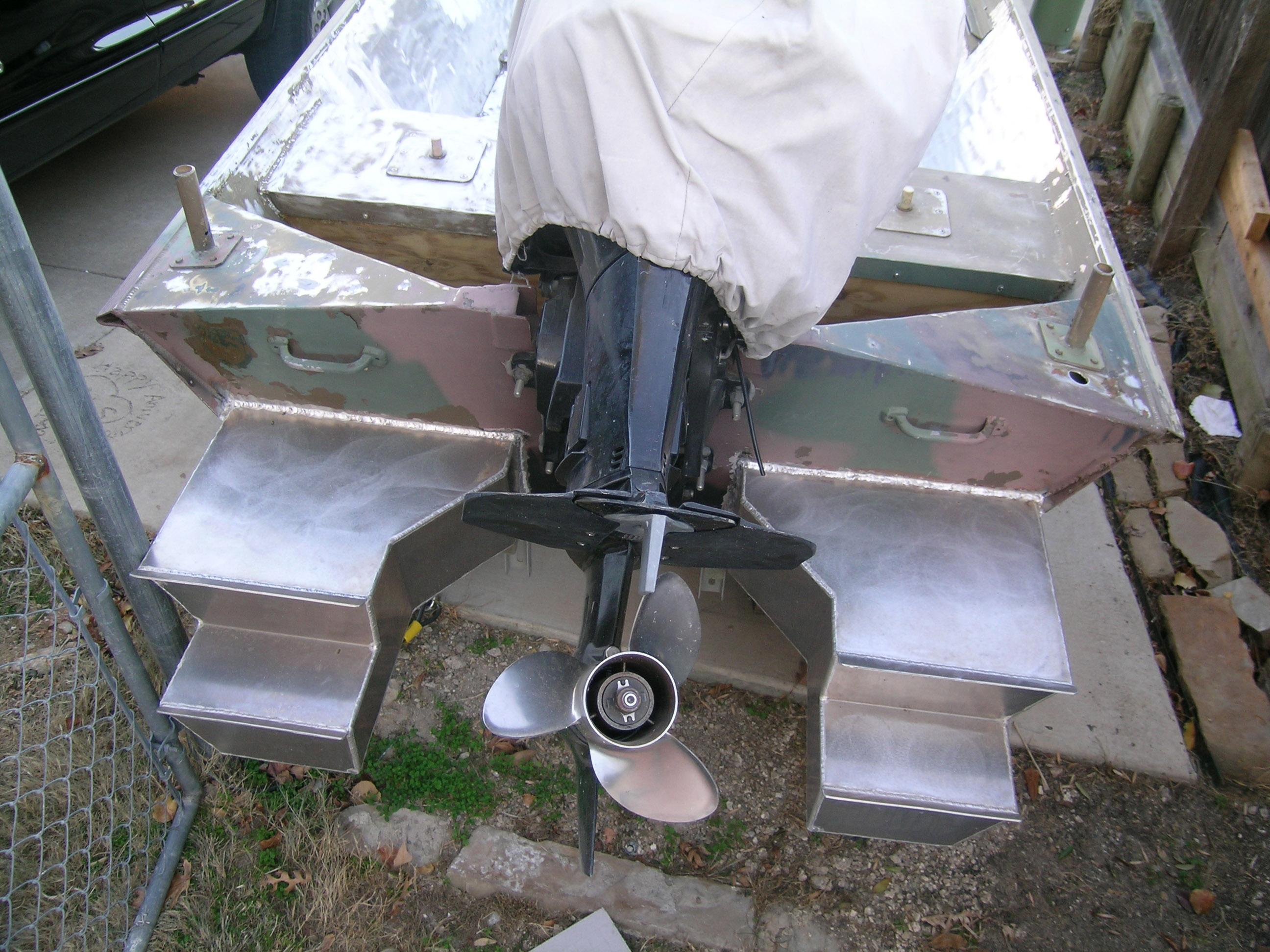 This portion of the project was designed to solve several issues: 1. Add floatation: The pods are constructed as tanks and pressure tested, then welded to the transom. Approximately 140 pounds floatation/displacement was added. 2. Add planing surface to reduce or eliminate porpoising and aid in planing in shallow water. 3. Provide dog platform for waterfowling. 4. Provide steps to get back into boat for dogs (or people). 5. Every good yacht has a party platform!