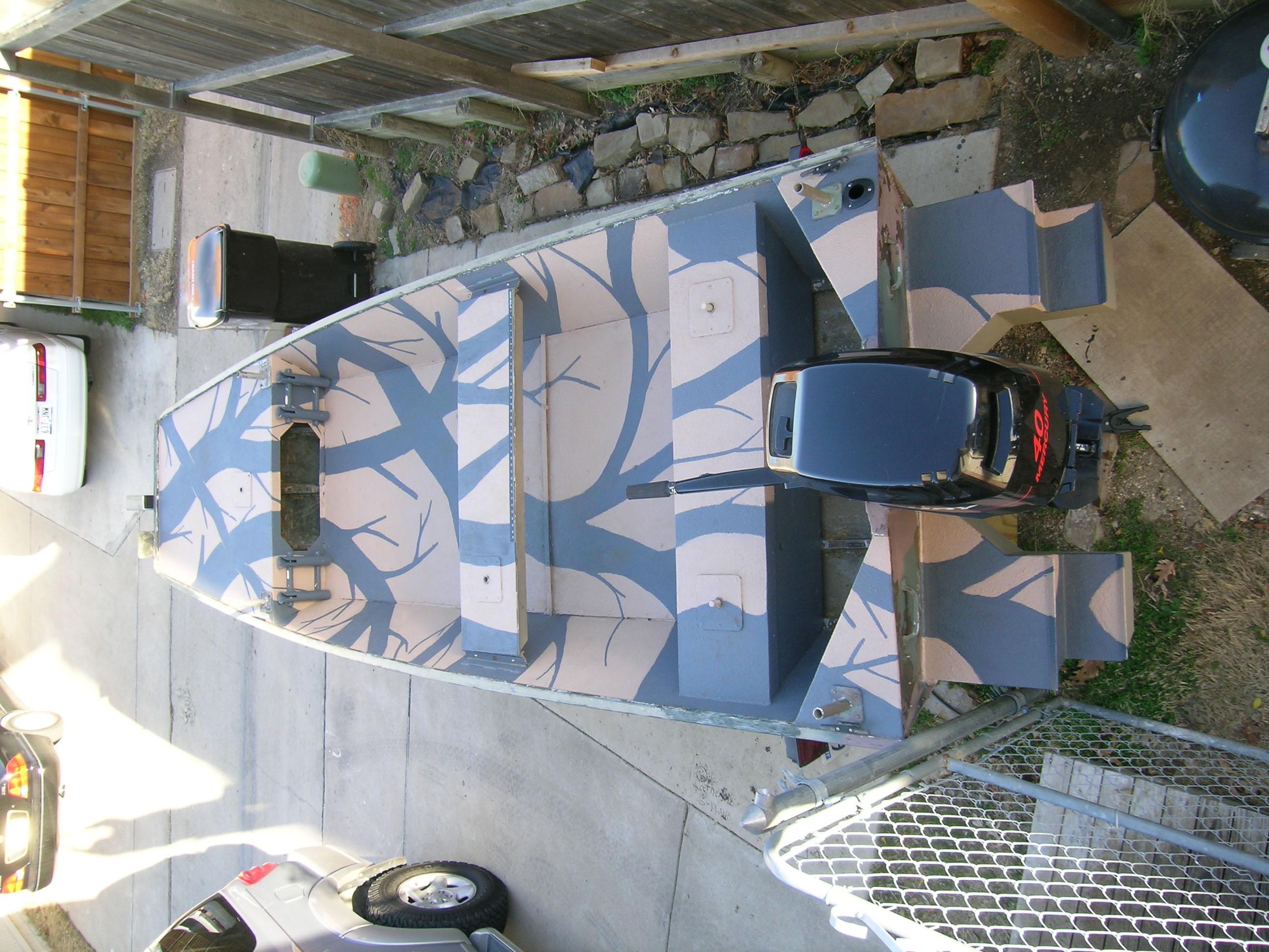 Carpet removed and Durabak Roll on liner applied. Beige (sand) and grey were used. The product was very easy to use. Be sure to mask areas not to be painted and wear gloves, as it sticks to everything! Aluminum deck was sanded to bare metal, washed with water, then washed with a 50/50 water/vinegar mix. Then a zinc chromate primer was applied. The first coat of Durabak was applied within 12 hours, starting with the grey trees, then beige background. Two coats of each were applied. The smaller branches were painted after 2 coats of both colors were built up.