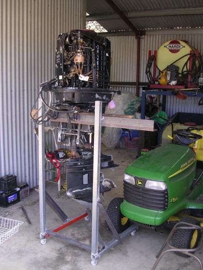 A simple stand I constructed to keep the engine off the boat. You may be able to see that the engine does not have a proper coat of paint on it, as it being repainted whilst the transom is redone.