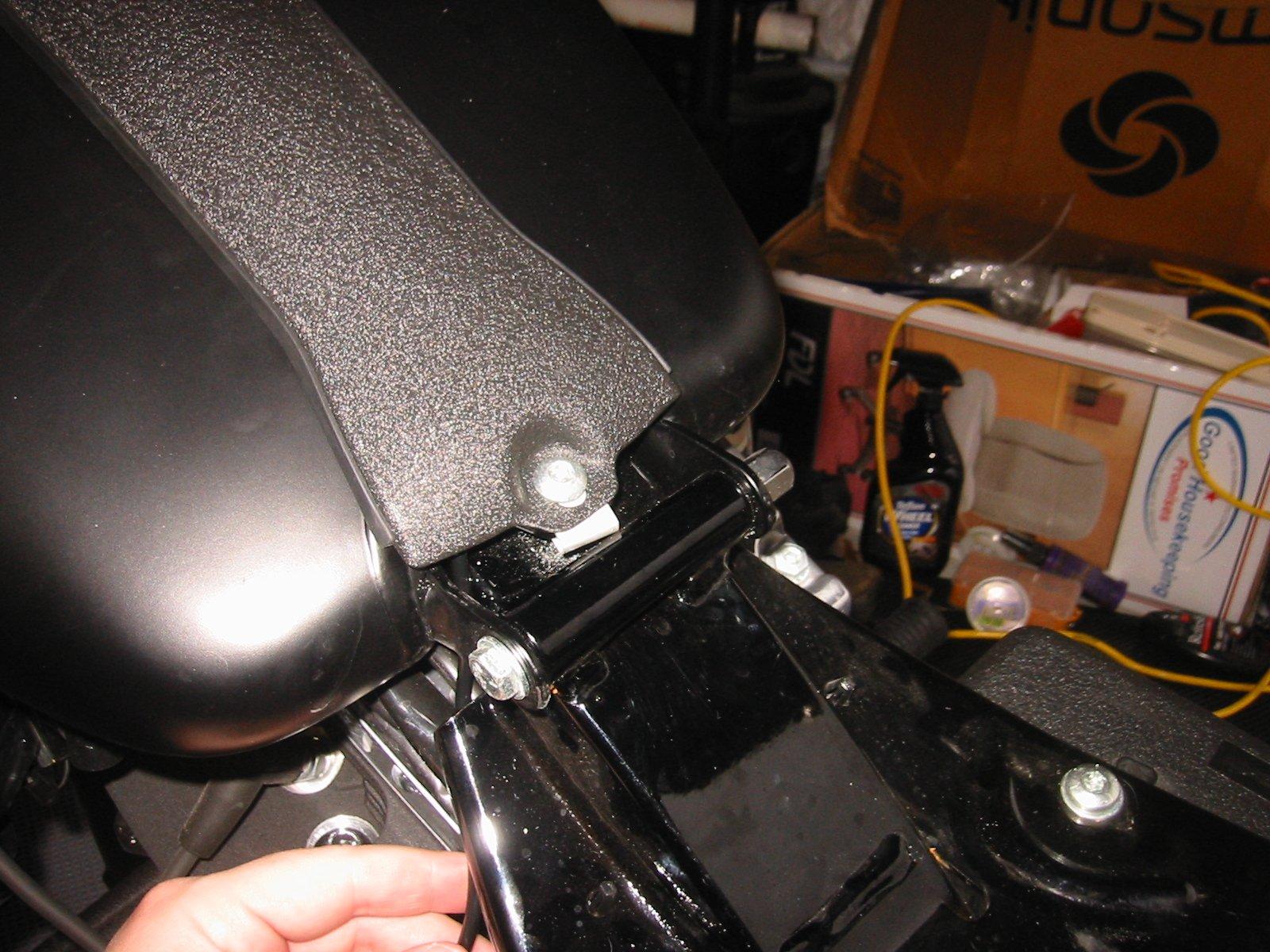 There is room just inside that left tank mounting tab to bring the wire down through a hole. This is important so you keep the wire clear of the mounting tab on the front of the seat. You'll slide that seat tab under this bolt in the center, so that wire needs to be off to the side to avoid threat of being cut or damaged.