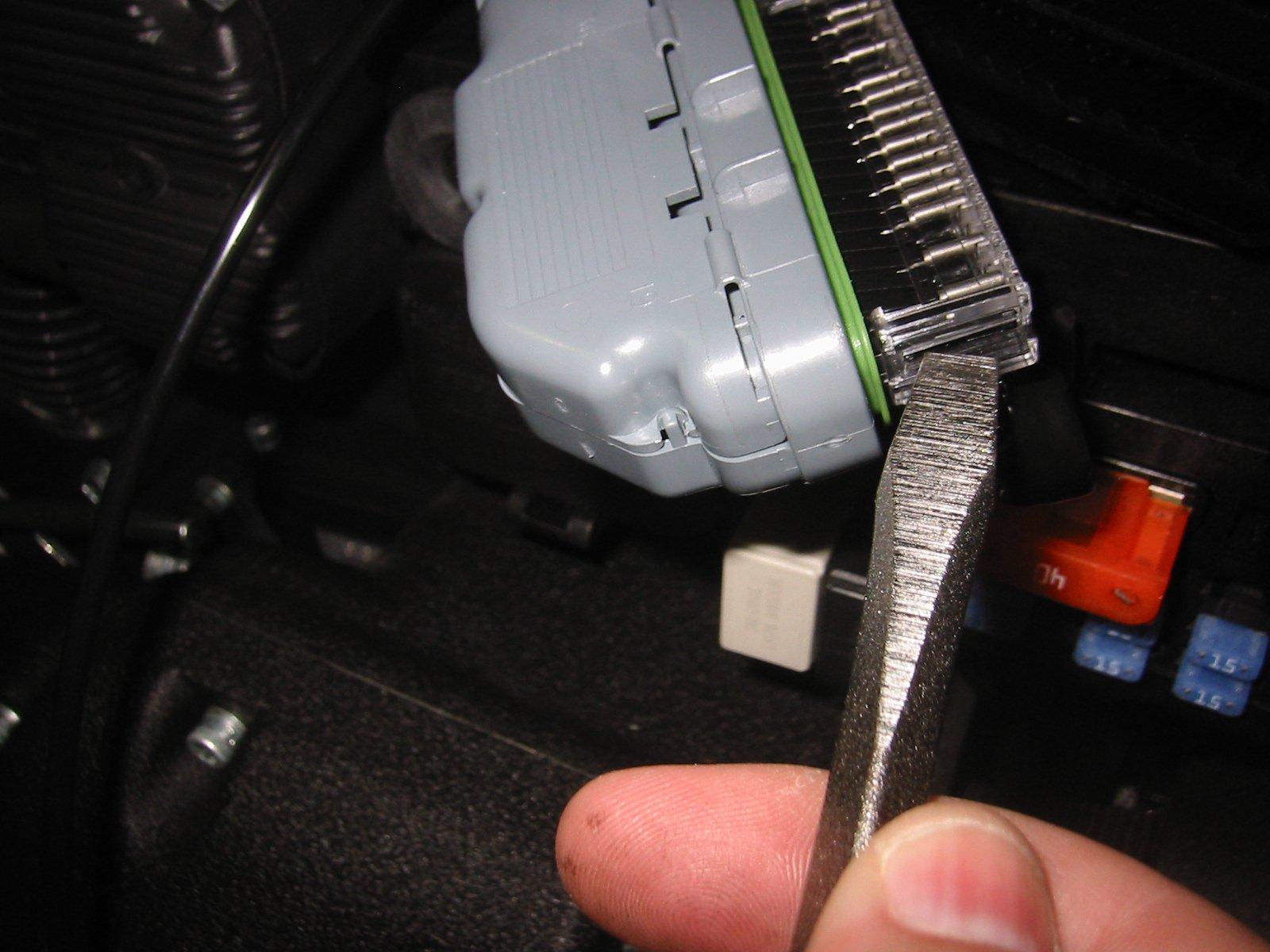 On the under side of the ECM connector is a release tab. Press the release tab and pull the connector free from its socket.