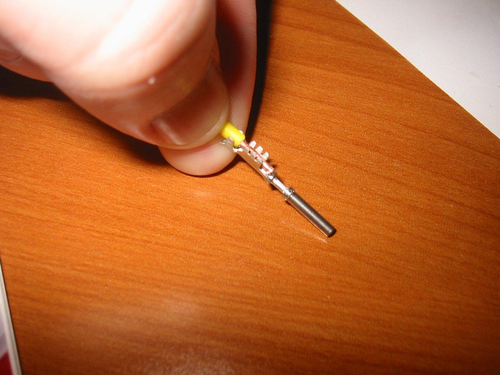Crimp the "Terminal Socket" appropriate for this connector, H-D 72076-00 onto the tach signal wire. The proper tool no doubt makes this a lot easier, but if you are careful, you can get a good crimp. You need to crimp these in such a way to maintain a round shape, don't just squash the crap out of it or else you'll never get the crimped area into that small hole in the ECM connector.