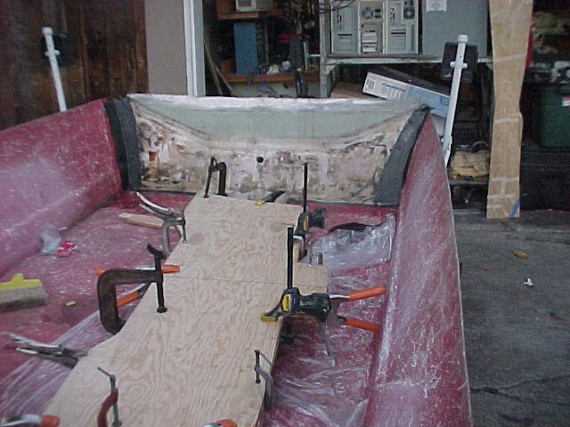 The new transom drying. I have 3x mat layers, 2x cloth layers and 2x 6" strips of carbon fiber between the 2 sheets of 1/2" marine ply. The Lark 40 has the longshaft so I decided to raise the transom for it.