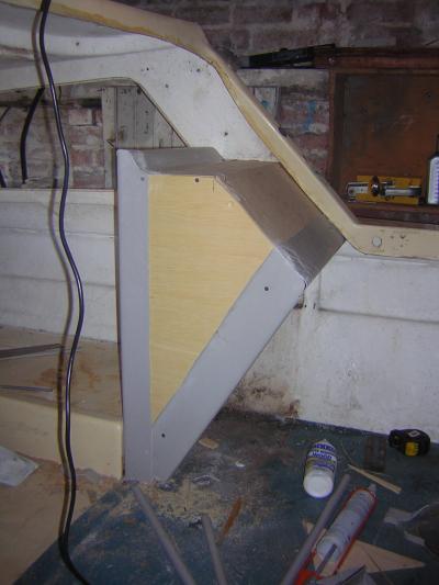ripped out old ply console and rebuilt this new one,made up of 9mm ply,the grey edging around the ply is preformed glassfibre for use on glassfibre flat roofs,I'll give this a couple of layers of matting then paint it the same as the rest of the inside of the boat when i get round to doing it