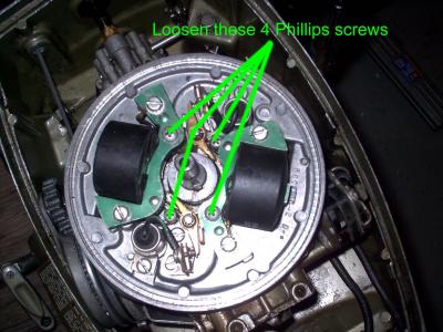 Pull off the points cam and set it aside. Then completely loosen the 4 phillips screws.