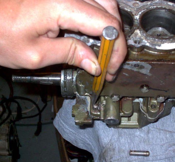 These are tapered to exactly align the front half of the crankcase/block with the back half. They must be driven out from the small side, or you'll crack the block. A small punch and hammer works well for this. Next, remove the screws that hold the crankcase together. There are 6 total, 4 on the periphery and the two behind the reeds.