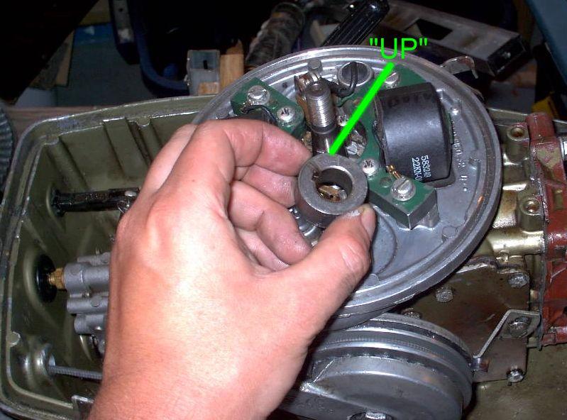 Normally the point's rubbing blocks are lubricated by a wick; a felt, oil soaked wiper attached to one of the ignition coils. If that is present, renew it with a few drops of light oil. If there is no wick present, lubricate the outside of point's cam with a light coat of high performance moly grease. Install the cam making sure the word "Top" faces upward.