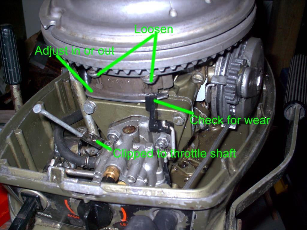 Once the engine is assembled it's time to adjust the linkage. The object here is to synchronize the spark advance with the carburetor. You want it adjusted so the throttle plate on the carburetor just begins to open when the mark on the follower's cam is just to the left of the black plastic follower.