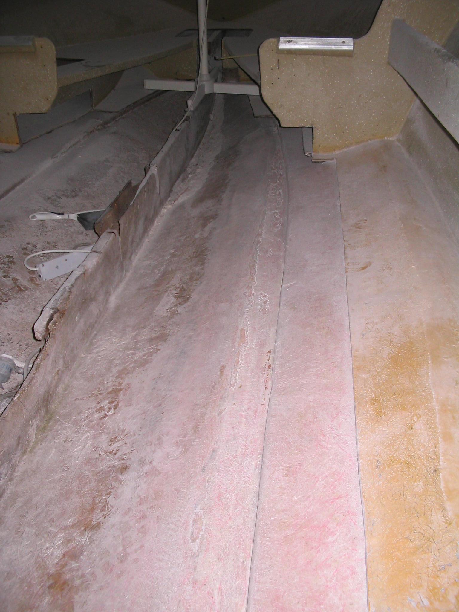 I was very unsure about how far to grind, although it became self explanatory as I went along. My concern was that I would go threw the hull. my decision was that I had to have a good clean surface for the best adhesion of new product, which sometimes meant grinding into glass matting to remove old flaky resin. In parts this made the hull quite flimsy. To fix this I decided to reglass the entire inside hull.