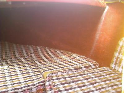 The cushions look intact, but they're shot. Luckily, they're all in one piece - perfect for a pattern... Gotta lose that lame red carpet too. Some nice Hulliner will go here.