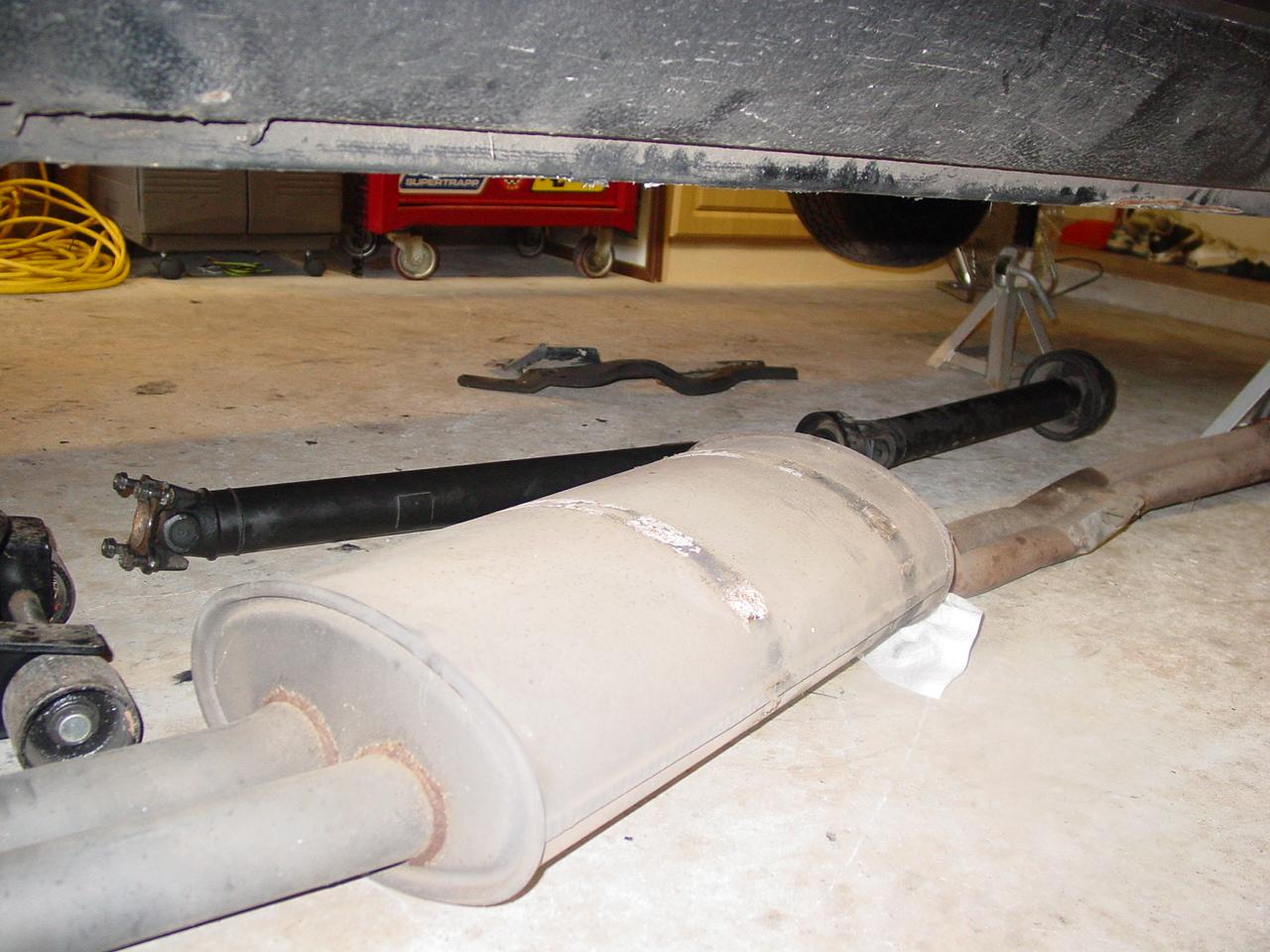 Both the driveshaft and exhaust, after saying some bad words and spilled blood, are now on the ground. Victory is mine.
