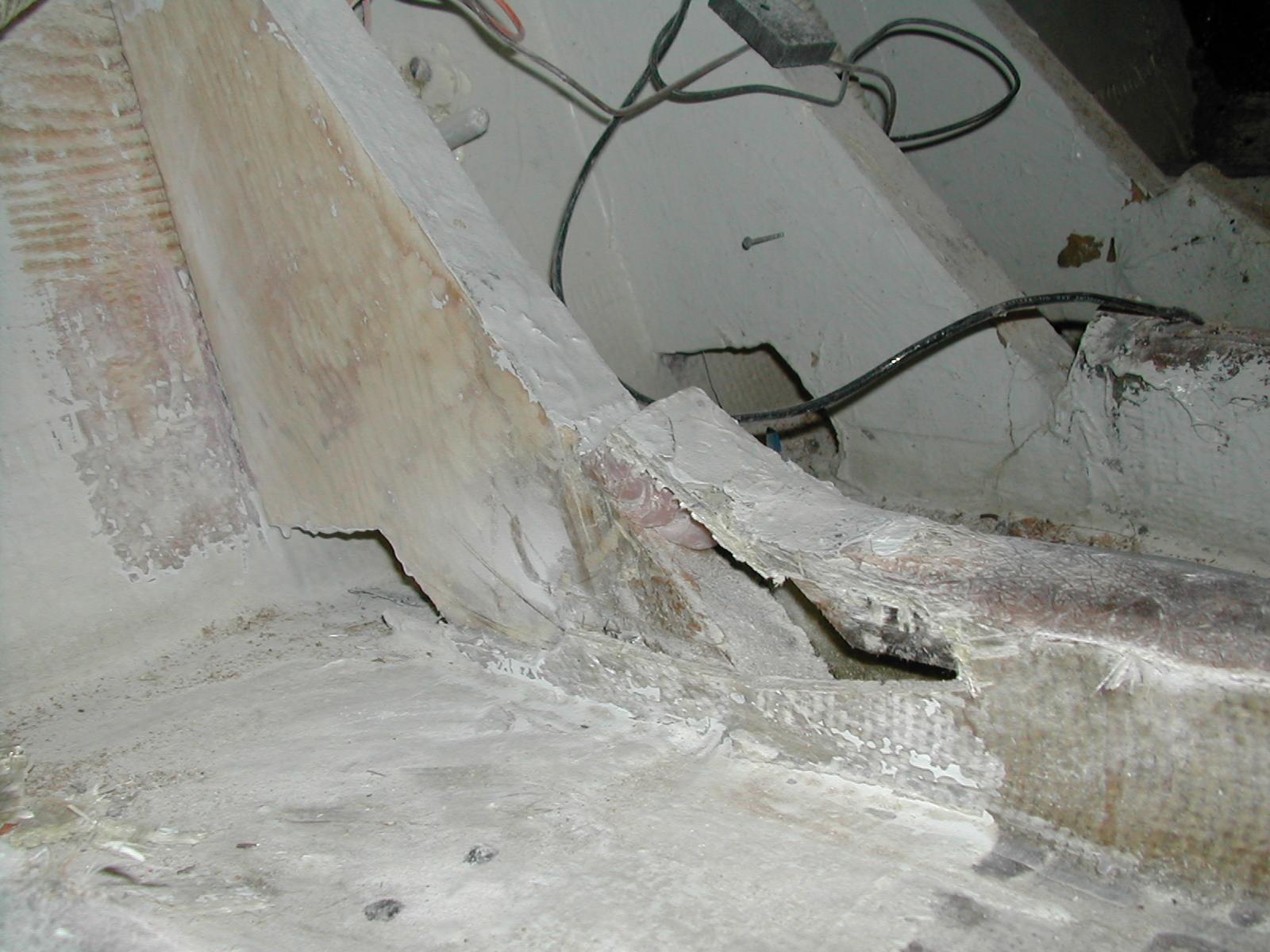 Took the circular saw and tried to even it out, and lord and behold, there is no wood, first thought... the ever dreaded dry rot... but no wood at all. Upon further investigation, found a 1X2 on the top of the stringer. Looks like they use that to creat a frame and create an almost all fiberglass stringer.
