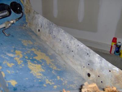 Finally after about half an hour of bending metal tabs back where the bolts went into the transom wood I got it out. Not in one whole piece, but in three. The rotted wood seem to split where the curved section started.