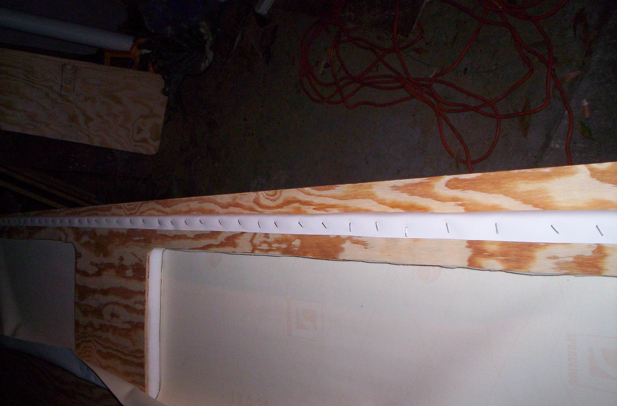 I started by running a line of staples through the vinyl on the long, bottom edge of the upholstery part. (the plywood underneath is just being used as a table - not part of the project)
