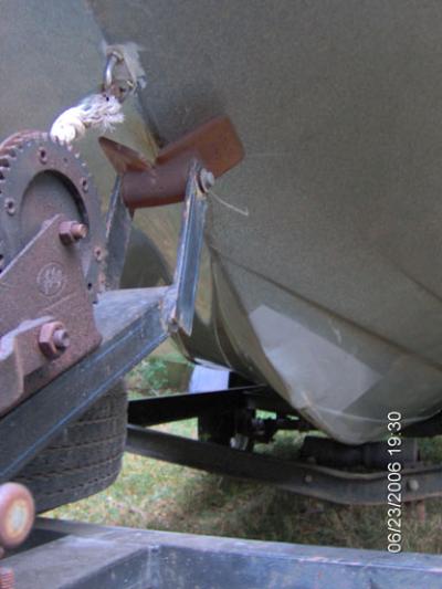 The hook is loose with signs or prior unsuccessful attempts to repair. Also a patch applied farther under the boat and poorly repaired and a possible source for my leak
